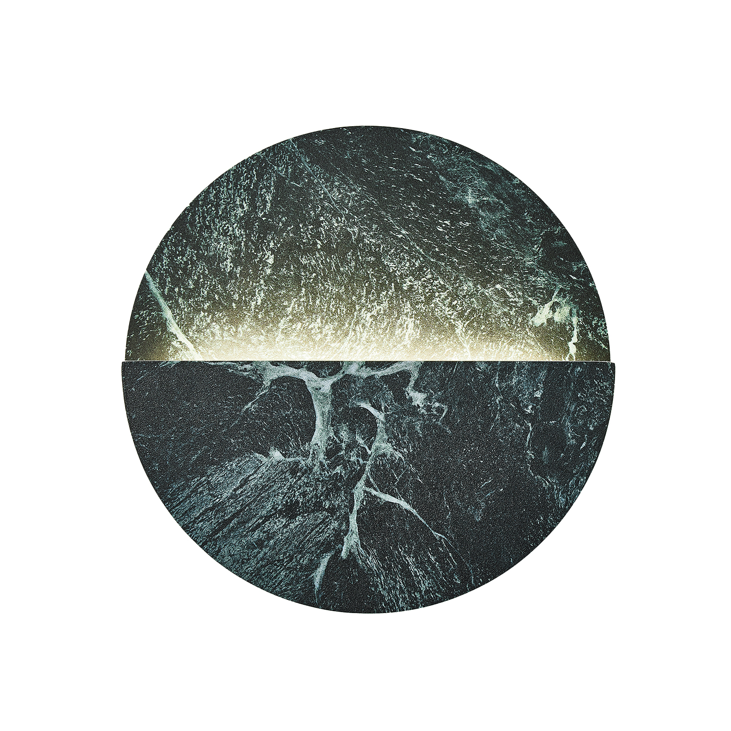 Представляем вам коллекцию Eclipsis, словно созданную самой природой. бра представляет собой две половинки диска из керамогранита, между которыми струится мягкий свет, создавая завораживающее зрелище, напоминающее затмение небесных тел. Коллекция выполнена из искусственного мрамора (керамогранита) в двух цветовых решениях: в оттенках серого или зелёного цвета. Узор камня оживают благодаря игре света и усиливают оптический эффект.