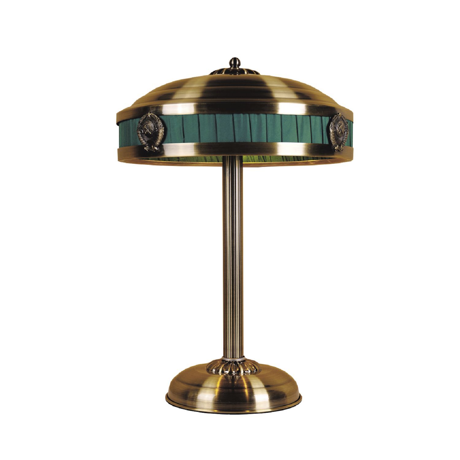 Подвесная люстра представлена в цвете античная бронза, оснащена тремя лампами для качественного освещения. Тканевые зеленые вставки абажура и декоративная деталь в виде герба хорошо сочетаются с другими элементами в стиле советской эпохи.