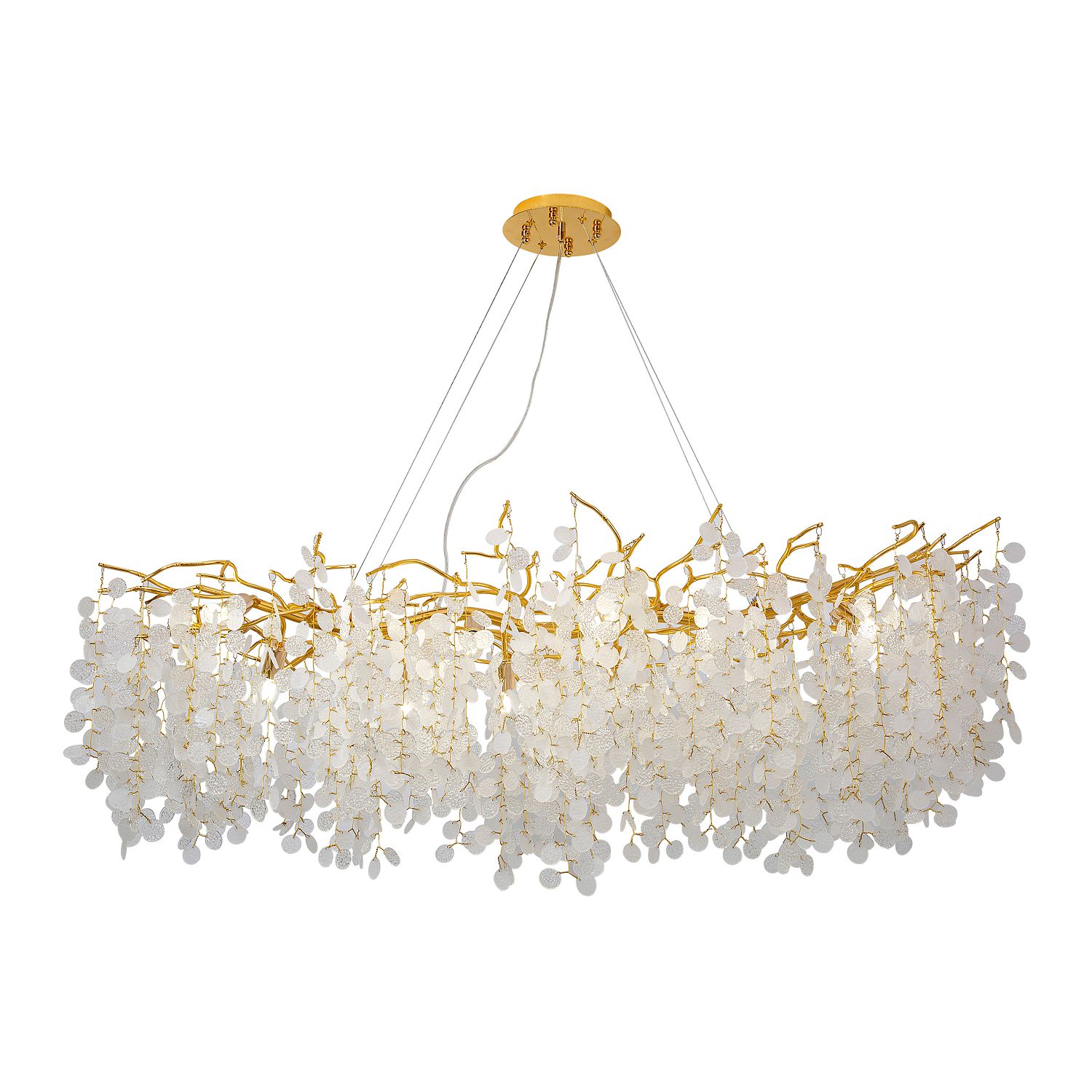 Светильники, стилизованные под ветви деревьев, становятся особенно актуальными в этом сезоне. В нашей коллекции мы представили две люстры овальной формы, что тоже является модным трендом. Каркас светильников покрыт золотом гальваническим способом. Подвески представляют собой нанизанные на тонкие проволочки круглые стекла белого и прозрачного цвета, напоминая свисающие соцветия экзотических растений.
