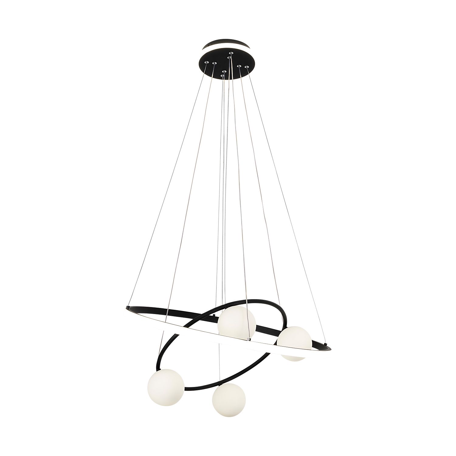 Светильники Orbium сочетают в себе две технологии современного освещения – кольцо со встроенной LEDлентой переплетается с кольцом из металлической трубки, в которую инсталлированы плафоны в виде шара. Потолочное основание также оформлено LEDлентой по кругу. Светильники оснащены дистанционным пультом управления, который позволяет менять как мощность, так и цветопередачу светильников. Три цветовых решения позволят подобрать оптимальный светильник.