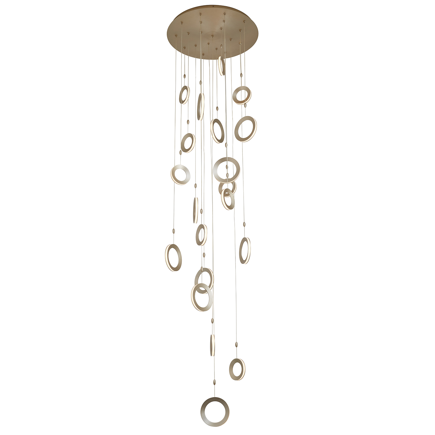 Коллекция Jongleur демонстрирует искусство баланса и динамики, где каждый элемент словно находится в постоянном движении. В качестве плафонов использованы объемные кольца цвета матовой латуни, которые светятся по периметру с помощью встроенной LEDленты. Они закреплены под разным углом к тонкому черному каркасу светильника, будто вращаются вокруг основания, словно цирковые обручи хулахуп.