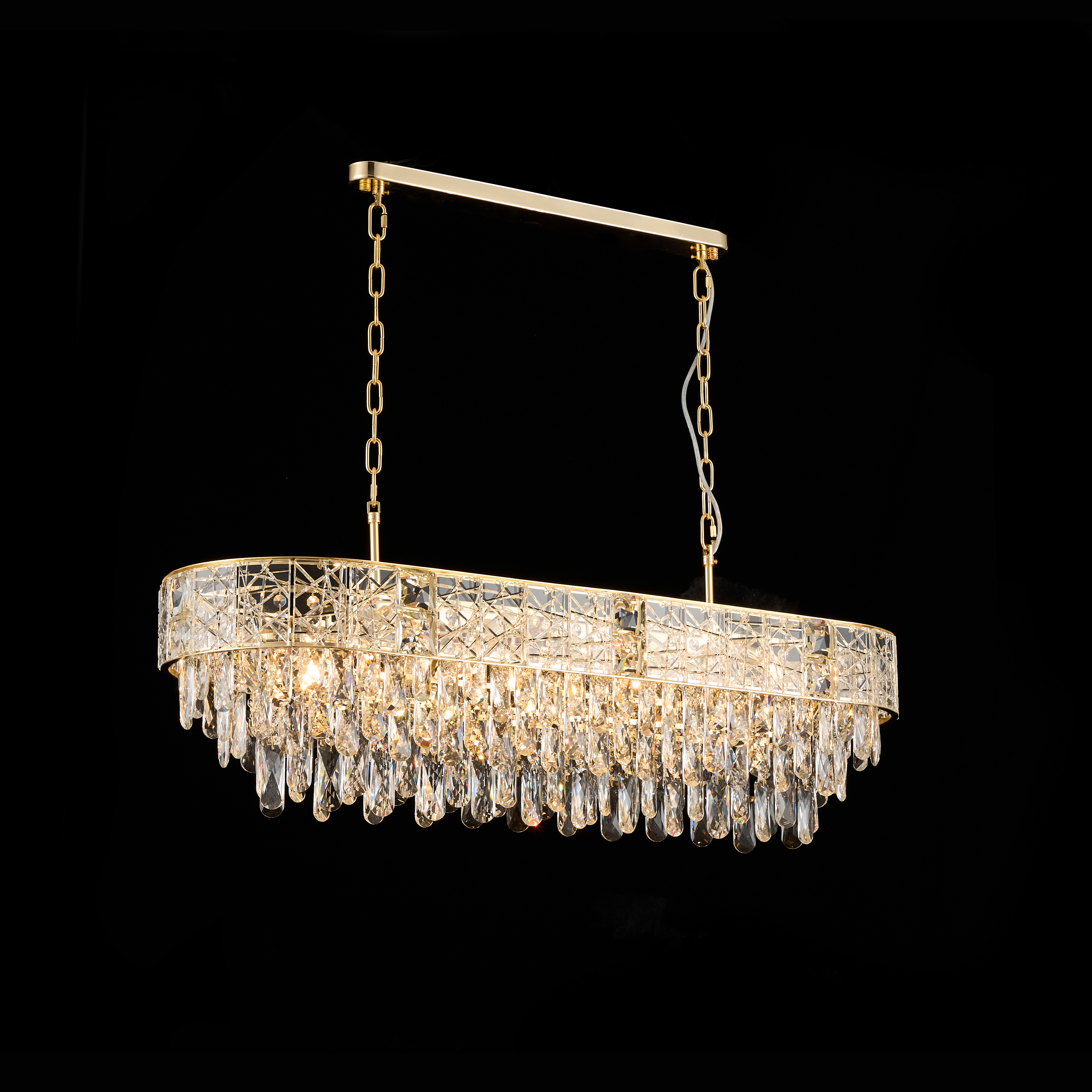 Роскошный дизайн хрустальных люстр и бра Elysium неминуемо будет притягивать к себе взгляды. Каждый элемент этой коллекции тщательно продуман, чтобы создать атмосферу изысканности и элегантности: золотой каркас удачно дополнен декоративным ободком из прозрачных стеклянных пластин с геометрическим узором и каскадом из крупного хрусталя изысканной формы. Отражая свет, он создаёт волшебные блики, играет с тенями и обретает свой завораживающий вид.