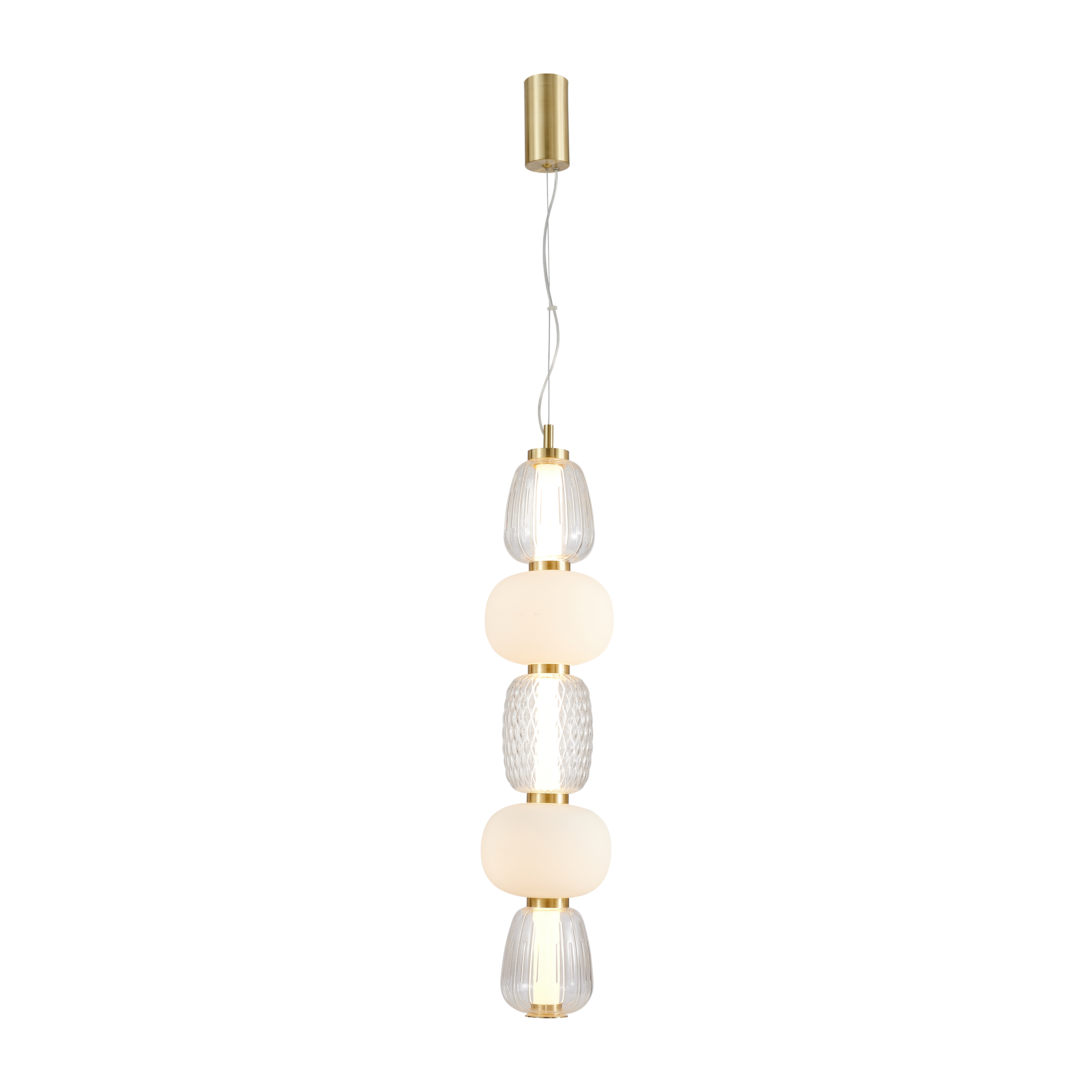 Чередование стеклянных плафонов разной формы, цвета и рисунка, а также цветовое решение каркаса в золоте создает насыщенный сложный и дорогой образ. Плафоны из стекла выдуваются вручную