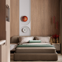 Архитектурная композиция стены за изголовьем — с её ритмом и округлыми формами, была дополнена бра из коллекции Rueda. Тёплый терракотовый и молочный оттенки, матовые фактуры и лаконичные формы создали ощущение тактильного уюта. Два подвеса из коллекции Doodle, установленные на разной высоте, стали не только стильным акцентом, но и функциональным решением: мягкий направленный свет создал комфортную обстановку для чтения.