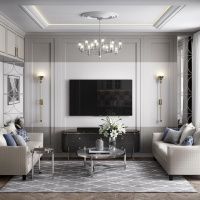 Сохранена атмосфера легкой классики с ноткой пикантности. Невесомый текстиль, спокойные цвета, изящная мебель, паркет. Люстра коллекции Aesthetic от Favourite (арт. 2672-16P) идеально вписалась в монохромный интерьер.