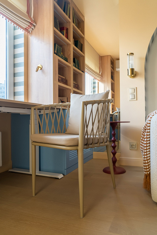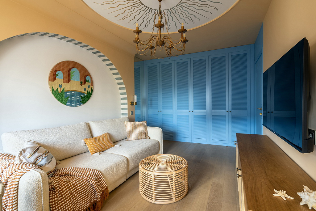 Песочные тона, глубокий синий, округлые арки и наш свет, который подчеркнул уют и выявил всю глубину дизайнерской палитры.