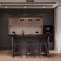 Сердцем квартиры стала кухня, где заказчики будут наслаждаться приготовлением еды и проведением времени с семьей и друзьями. Центром притяжения кухни является функциональный остров, над которым размещена подвесная люстра, выполненная в скандинавском стиле. Каркас светильника сочетает два материала натуральное дерево и металл в черном цвете. Рядом расположен небольшой круглый стол, который освещает композиция из трех подвесов этой же коллекции, они обеспечивают мягкое и комфортное освещение, создавая приятную атмосферу для общения и отдыха.
