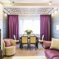 Столовая зона у окна визуально выделена потолочной конструкцией. Это прямоугольник из гипсокартона с нишей в центре, которую мы подсветили диодной лентой и закрыли декоративной решеткой. Эскиз орнамента потолочной ажурной панели дизайнер Диана Ханнанова нарисовала в специальной программе, после чего в мастерской с помощью фрезерного станка решетку вырезали из плиты МДФ. Рисунок на потолке - стилизация под древний японский орнамент хиси, которому уже 12 тыс лет. Резные элементы, будь то: панно из МДФ или фанеры, кованные или перфорированные перегородки, а также потолочные модули, на сегодня, пожалуй, самые трендовые детали. В интерьере Дианы Ханнановой резная потолочная решетка- первый намек на японскую стилистику интерьера. Бронзовые матовые зеркальные панели тоже выглядят вполне по-азиатски, ими задекорировали стены столовой. Обеденная группа строго-минималистичная, что также напоминает об интерьерах страны заходящего солнца.