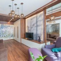 И наконец, центральная цасть помещения, которая выполняет сразу функцию гостиной и спальни. Здесь опустился туман не в переносном, а в буквальном смысле: на стене появилась сосновая рама, в центре которой наклеены обои с изображением соснового леса и все это закрыто листом полупрозрачного матового поликарбоната. Возле этого панно встала телевизионная тумба, а напротив — диван, за ним — тоже лес, напечатанный на пленке. Легким нажатием руки, стена за диваном опускается, превращаясь в просторную кровать с роскошным ортопедическим матрацем. В изголовье — тоже пленка с рисунками птиц и животных. Над головой — точечные светильники, а с двух сторон — стеллажи с подсветкой.