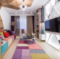Телевизионная зона решена как стеллаж, составленный из треугольных полочек с подсветкой.