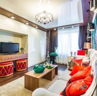 Для начала, чтобы потолок выглядел выше, мы опустили его по периметру, по бокам окрасили коричневым, а центр затянули виниловой пленкой ванильного оттенка. Центр потолка заняла оригинальная кованая люстра, комнату подсвечивают так же точечные светильники в серебряной массивной оправе. Вокруг двери наклеены обои с изображением английского леса. Эффект сепии дает ощущение того, что деревья буквально сошли со старинной фотографии. Одна из стен покрыта декоративной штукатуркой с эффектом золотистого шелка, поверх наклеены деревянные пазлы, сложенные в карту мира. Возле этой стены- две зоны: отдыха и рабочая. Удобный английский диван завален мягкими цветными подушками, а письменный стол встал под прямым углом к коричневой стене. Противоположную сторону заняли модульные белые глянцевые шкафы, в центре которых, на деревянную полку поставили телевизор, внизу — пуфы в виде больших барабанов.