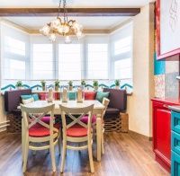 На потолке мы прикрепили коричневые балки полые внутри. Возле окошка — удобная скамья, сооруженная по принципу подиума, она декорирована плоскими балясинами, которые позволяют теплому воздуху из радиатора беспрепятственно поступать в помещение. Эта лавка заслана мягким матрацем и завалена цветными подушками.